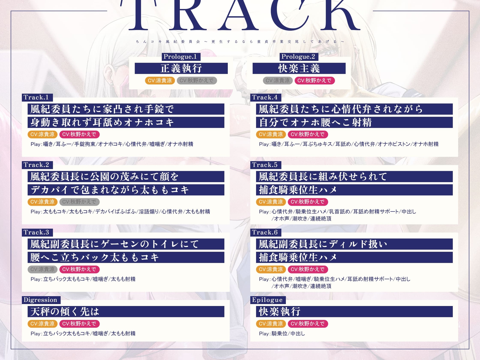 風紀委員たちによる女性優位なシチュエーションが満載の音声作品。KU100を使用した臨場感あふれる体験が楽しめます。